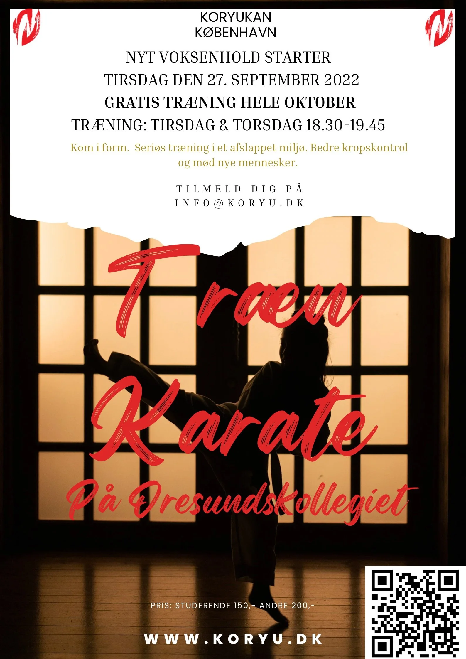 Vi er meget glade for at kunne annoncere at Koryukan København tager nye medlemmer ind fra tirsdag den 27. September kl 18.30 og der er GRATIS træning hele oktober.